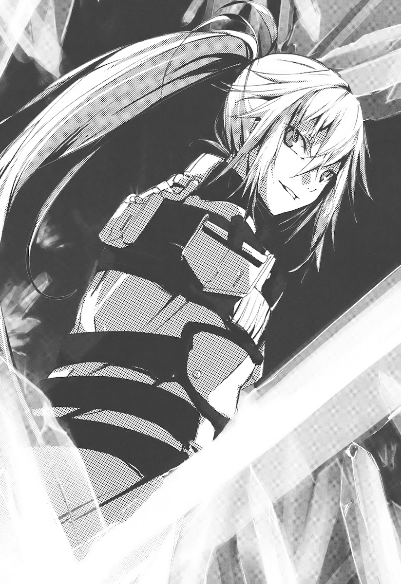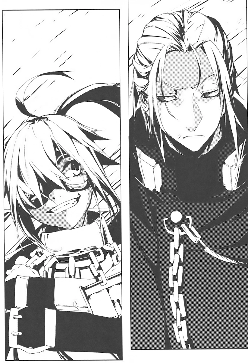 Hal tells Flamberge to shup up as she complains about the gloomy weather. According to Flamberge, the scenery with fog, drizzle and pollution is perfect for an ominous guy like Hal. He explains why he’s driving in circles. Four days ago, a single man attacked the embassy and wounded seven police officers. It’s said that the attacker didn’t stop even after getting shot twenty times. He disappeared when he was touched by sunlight. Flamberge gasps in disgust while thinking about zombies. Hal suspects that the monster was created by a Phantom Book user who was conducting an experiment. Soon, the terrorist will act again, probably to disrupt the post-war reconstruction meeting. Flamberge mocks Hal. After all, it won’t be easy to find the culprit and burn his Phantom Book. However, Hal apparently had already found his target.