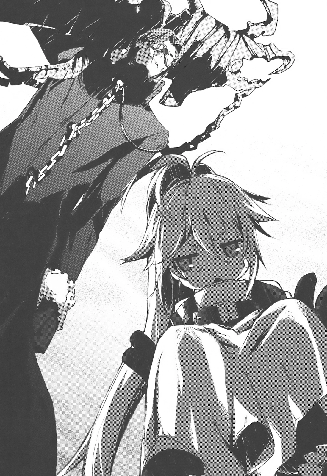 Because of the straitjacket, Flamberge drags her legs to follow Hal and Elisha to the castle’s library. Flamberge suddenly stops, feeling the blood in the air. The Scarlet Robe had killed the policemen who were waiting for Mithril. The witch recognizes Flamberge and Hal as a Biblioprincess and a key-keeper, respectively, although Hal identifies himself as a Book Burning Officer. The Scarlet Robe sends her familiars to kill the couple. Hal opens the Long Lost Library. He grabs a Phantom Book and uses its magical power to charge his staff. He uses his staff to burn the monsters, although the Scarlet Robe, Elisha’s doppelgänger, remains unharmed. The witch disappears, threatening to take Elisha’s life.