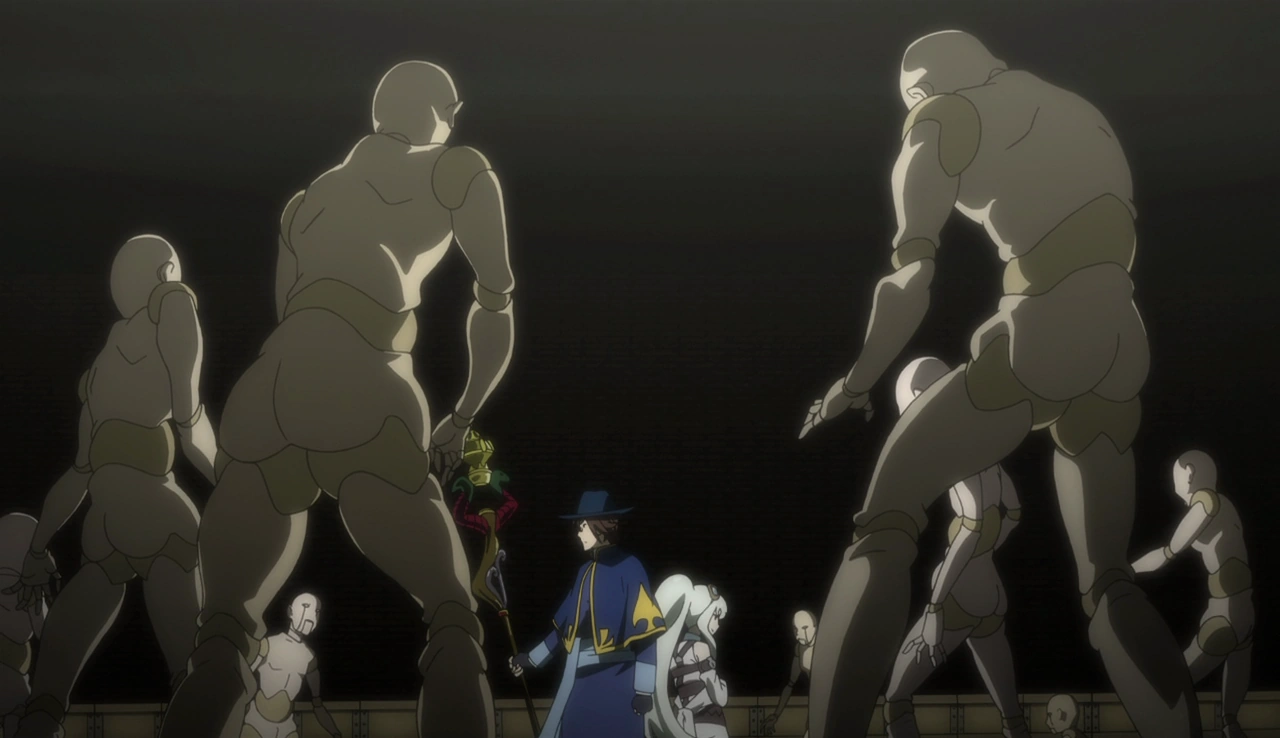 Hal enters a gloomy factory, carrying Flamberge on his shoulder like a bag. Hal explains that the factory is where wooden dolls controlled by magic are built to populate the town, replacing the inhabitants who died during the war. Flamberge laughs when she sees Mabel, who reveals herself as the user of the Rahōto Reihō Kaigen, a Phantom Book which grants the power of creating obedient puppets. Mabel orders the dolls to attack Hal and Flamberge. Hal opens the Long Lost Library. Mabel recognizes the Silver Biblioprincess. Hal reaches into the gap on Flamberge’s body to grab a Phantom Book. He uses the Phantom Book to charge his staff and burn the wooden dolls, the Rahōto Reihō Kaigen, and the corrupted part of Mabel’s soul.