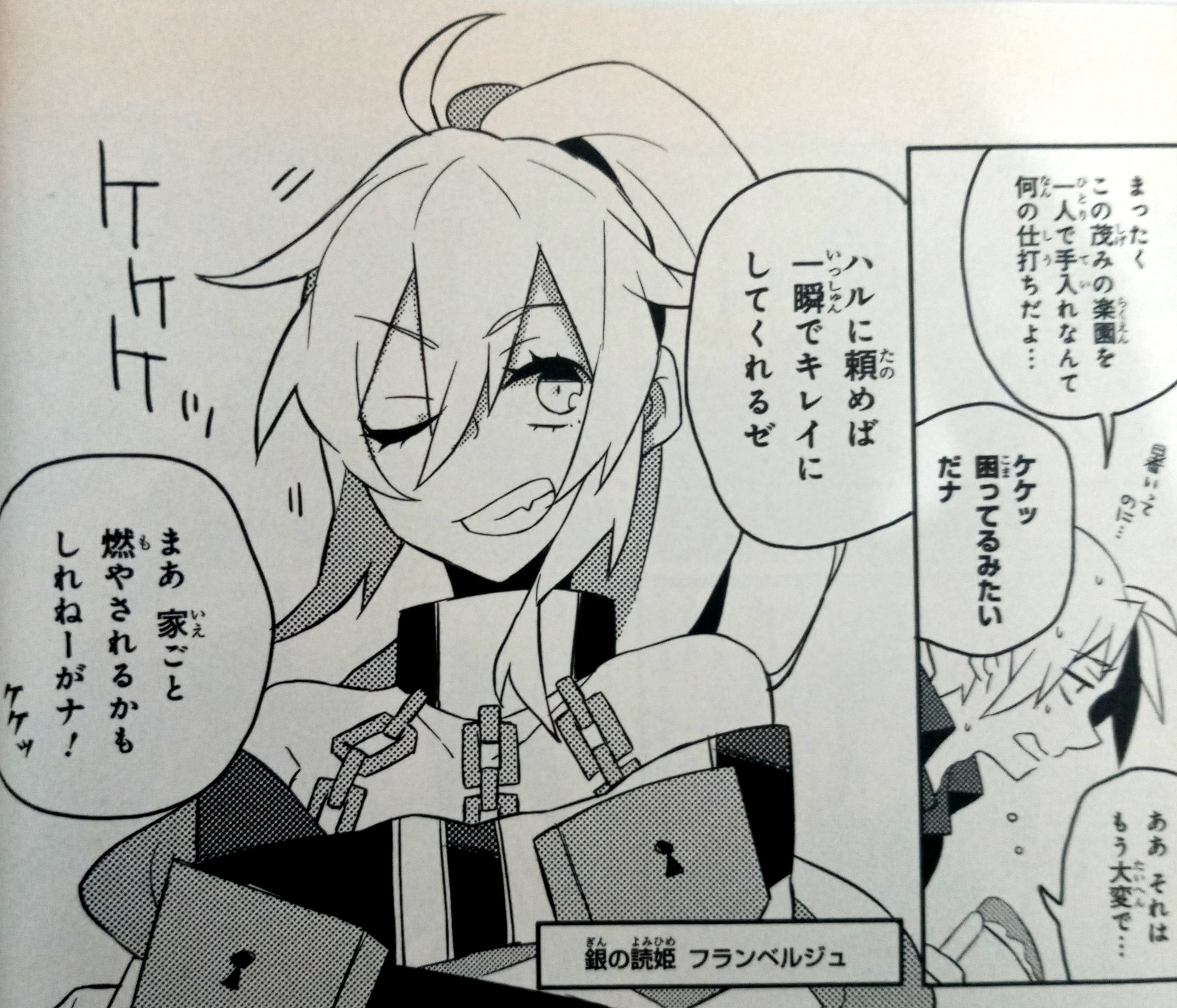 In Chapter 5, Flamberge and Hal visit the Disward estate for a Christmas party. They brought meat. It seems like Hal just caught a live chicken. Flamberge criticizes Dalian and Rasiel’s paper rings. Flamberge uses her feet to try it. She does an amazing job. The Christmas party starts. Flamberge and Hal brought a gift. Hal appears with a huge, intimidating box. It seems like there’s a beast inside. Flamberge tells everyone to be careful.[10]