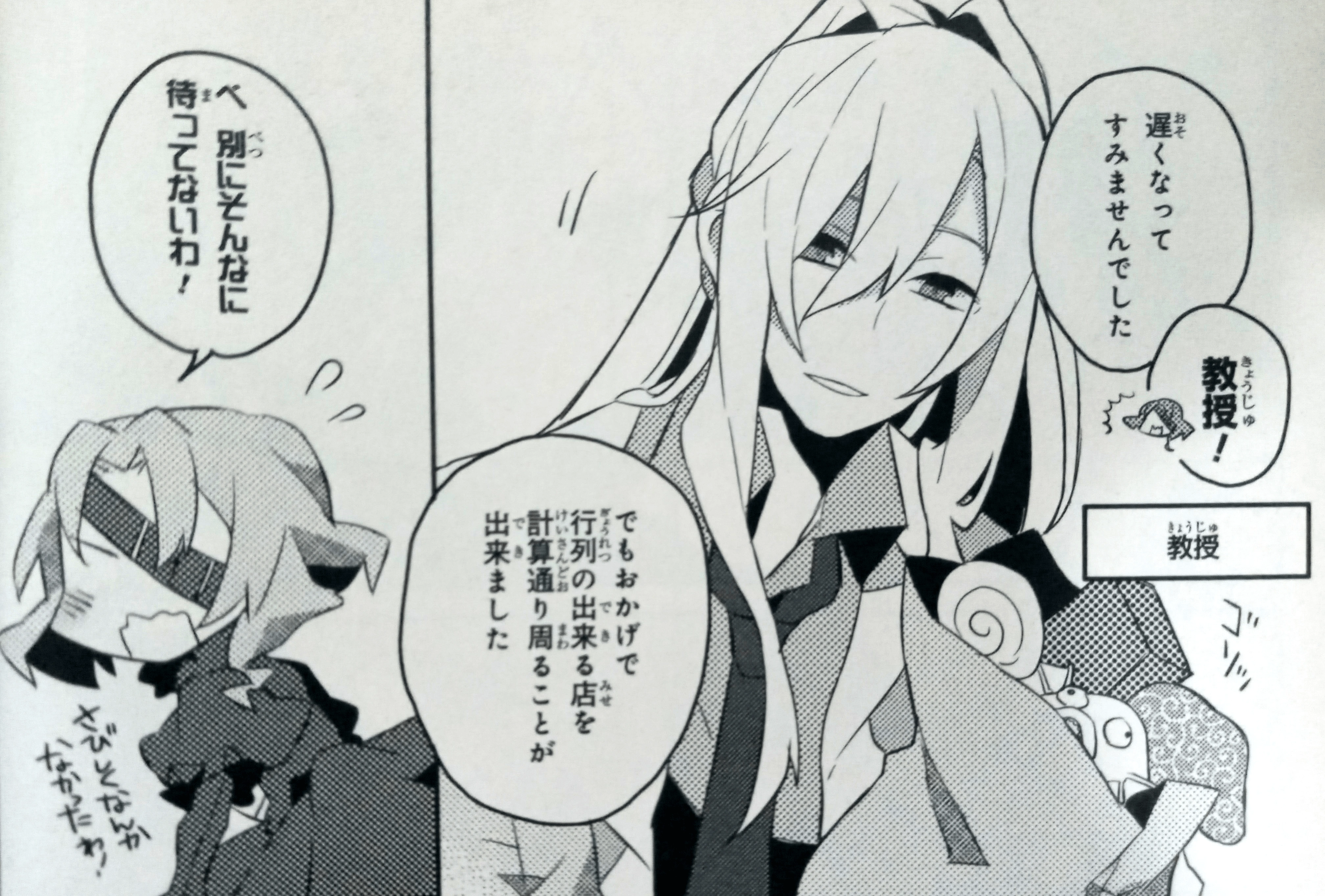 - To promote the anime, volumes 1 to 7 of the light novel were released with new covers depicting the character designs from the adaptation. The Professor was featured in volume 6.[26]
