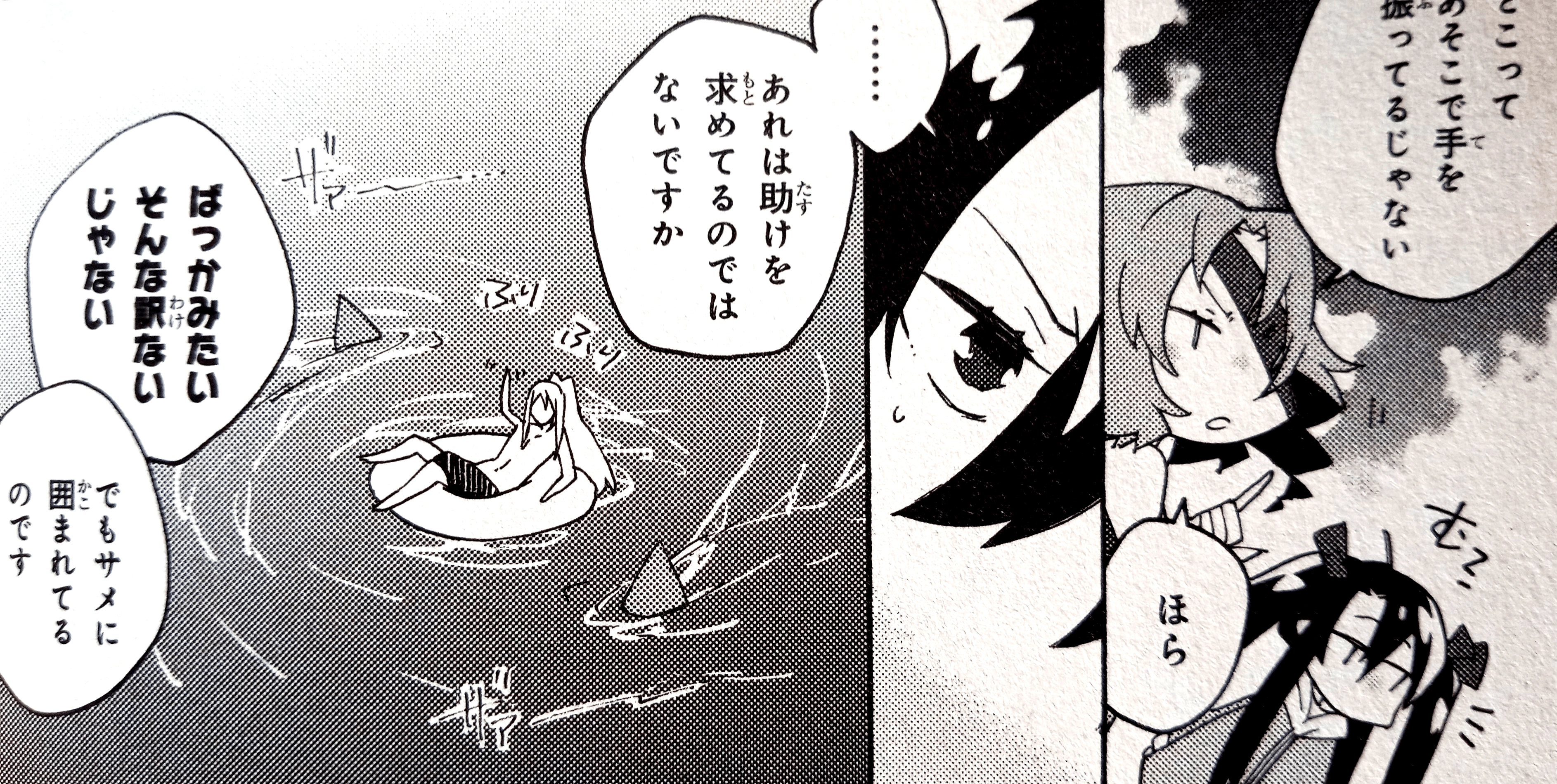 In Chapter 10, Hugh and Dalian go to the beach. Dalian meets Rasiel. The latter explains that she came to the beach with the Professor. He’s relaxing on a swim ring. Dalian notices that he’s surrounded by sharks. Rasiel affirms that he’s enjoying the thrill of the ocean, everything calculated. However, he’s clearly being attacked by the sharks.[22]