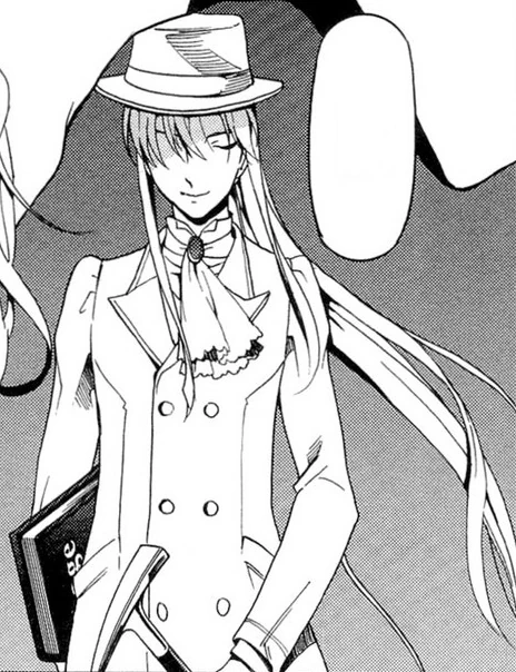 In the manga, he uses a light hat, a light cravat and a dark cane where a blade is concealed. His hair is longer in this adaptation.[6] In Dalian-chan's Bookshelf, the Professor is a handsome man who ties his long hair at the back of his head. He uses an olive tie and wears a white coat over a black shirt.[11]
